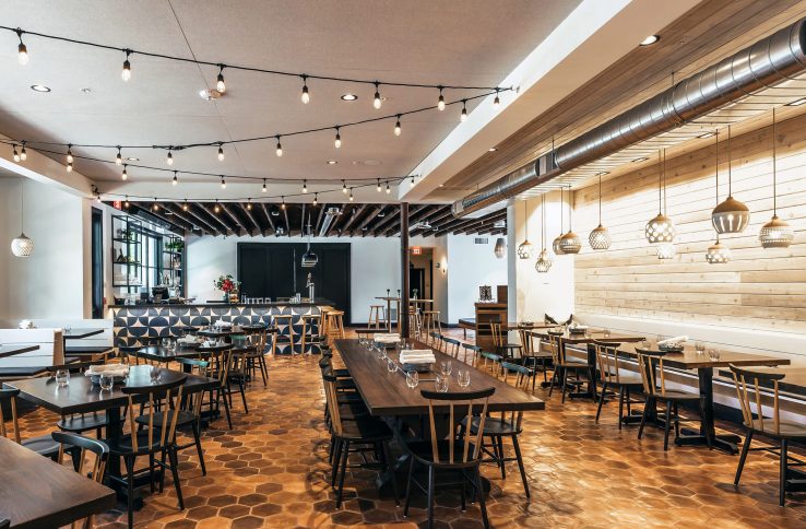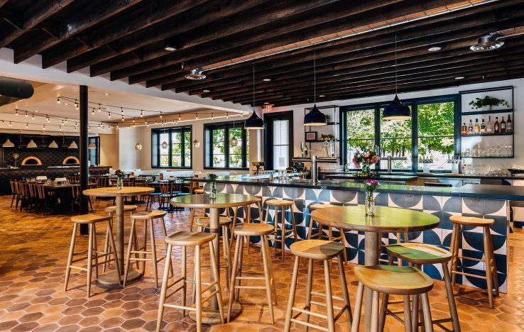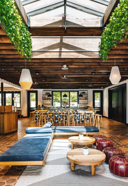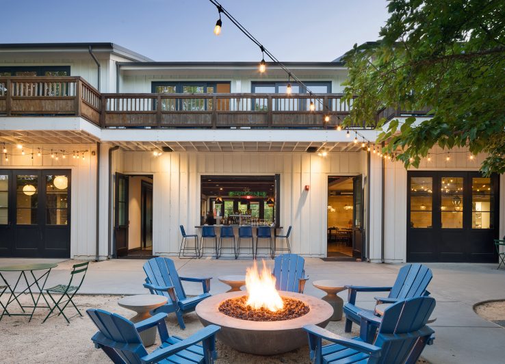 The second phase added a new structure to the resort. Built upon the footprint of the building that previously occupied the site, the new building added twelve new keys and dramatically increased the resort’s public spaces. A new reception area, expansive restaurant, private dining rooms, a micro-brewery and bar provide a multitude of opportunities for gathering. The second floor houses guest rooms transected by an open-air breezeway. The driving concept behind the design of the public spaces is to create an open, interconnected environment with through views that help to form a lively atmosphere and a layered experience of place. Every space is designed to be communal and approachable, and views are enlivened at every turn. From the covered porch, visitors can see through the lounge area to the bar at the rear of the building, a view that serves to draw them into the welcoming space, while bi-fold windows in the bar at the rear of the building open up to the pool annex, linking indoor and outdoor experiences. This connection to the pool annex and central gathering hub, with its outdoor fireplace, hammocks, park benches and string lights, is key to how this space serves as a link between the hotel’s three zones.